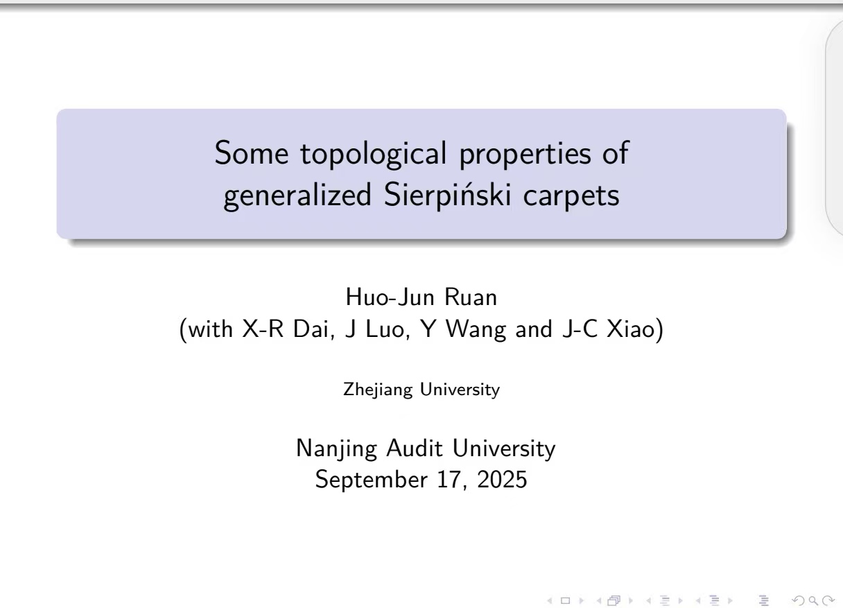 阮火军教授本次讲座的主题为:广义Sierpinski地毯的一些拓扑性质。在报告中,阮火军教授首先介绍了广义Sierpinski地毯的定义,以及针对该类分形集我们感兴趣的一些问题。接着,他详细梳理了国内外关于这些问题的研究进展。最后,阮火军教授简单介绍了他自己团队对于广义Sierpinski地毯的连通性以及割点问题的一些结果及其证明思路。